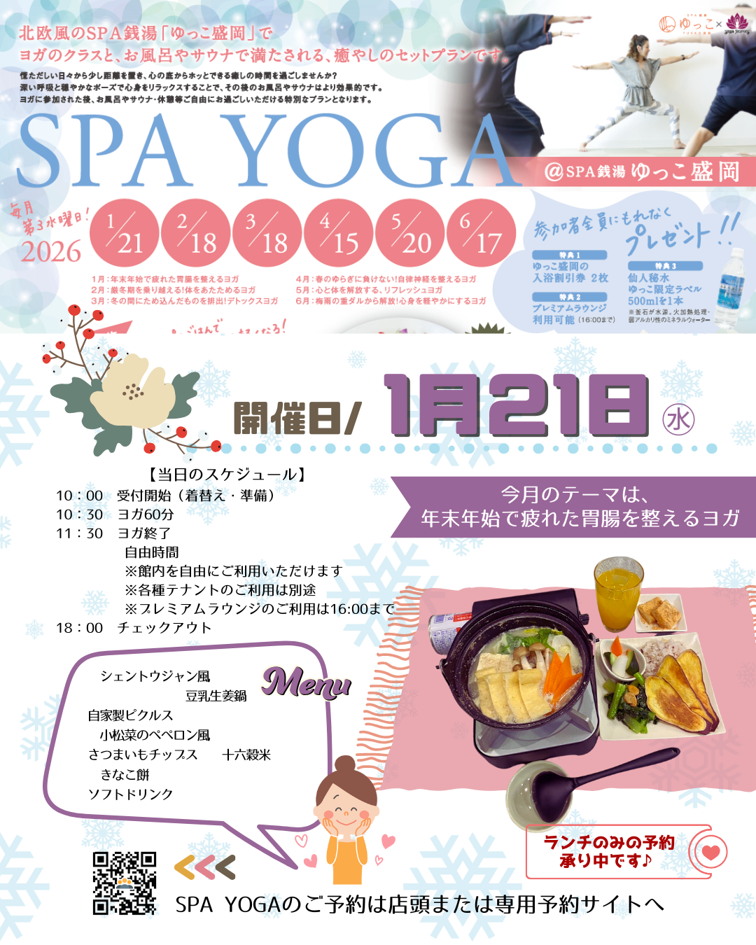 • 初心者でも安心の60分のヨガクラスと日帰り入浴休憩がセット。さらに、田村先生監修のヨガボウルがセットになったパックプランもあります。今回のヨガテーマ「年末年始に疲れた胃腸を整えるヨガ」に加え、ランチもやさしいメニューとなっております✨