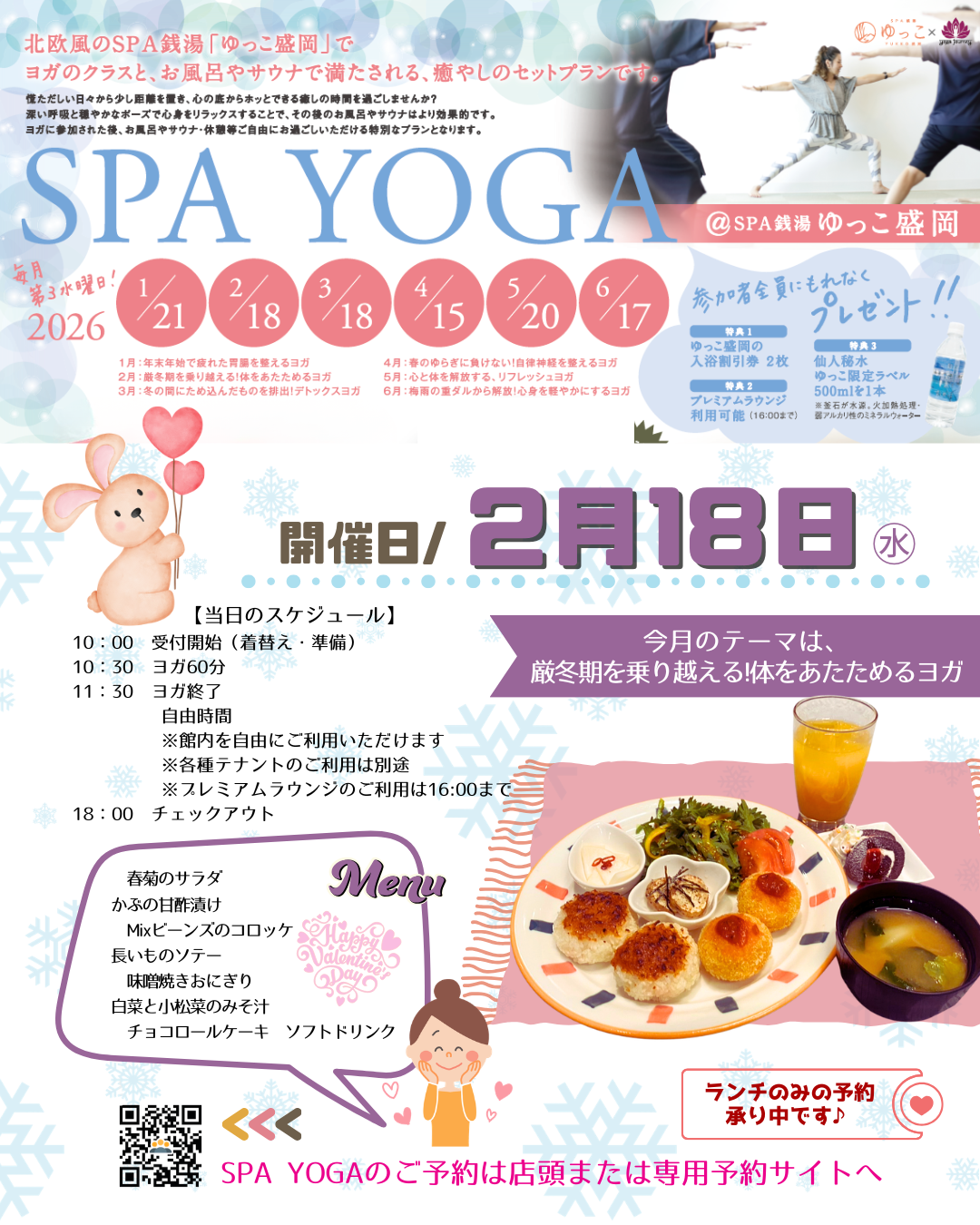 - 初心者でも安心の60分のヨガクラスと日帰り入浴休憩がセット。さらに、田村先生監修のヨガボウルがセットになったパックプランもあります。今回のテーマ「厳冬期を乗り切る!体をあたためるヨガ」に加え、ランチもやさしいメニューとなっております✨