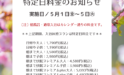 いつもご利用いただきまして誠にありがとうございます。 令和8年5月の営業につきましてご案内いたします。 本月も特定日料金の実施がございま...