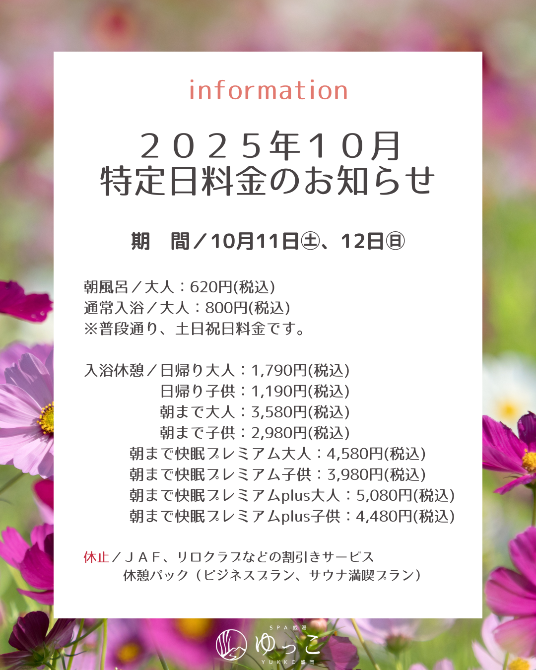 - 本月も特定日料金の実施がございます。何卒ご了承くださいます様、よろしくお願い申し上げます。
