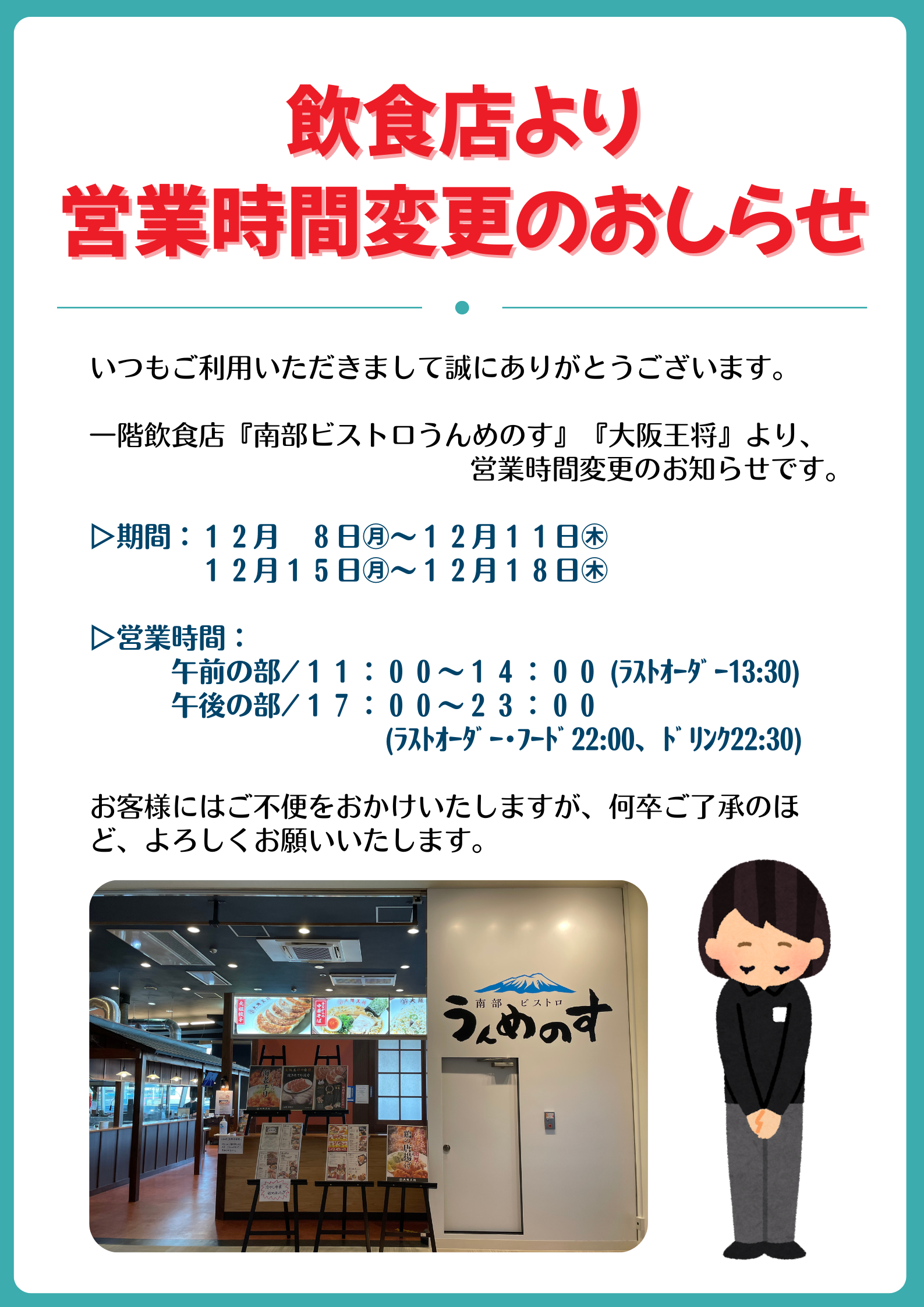 • 一階飲食店『南部ビストロうんめのす』『大阪王将』より、営業時間変更のお知らせです。