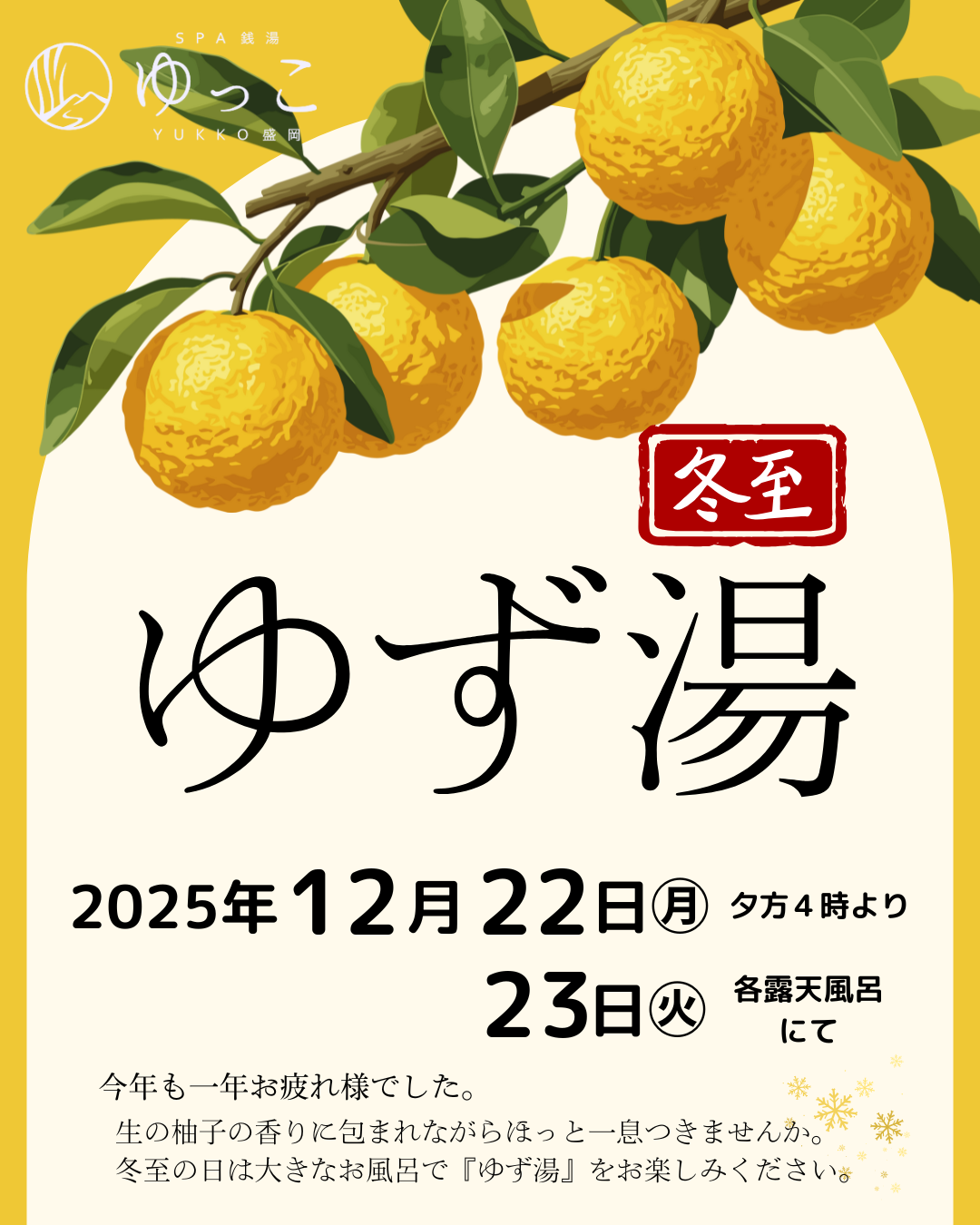 - ※12/22㊊:男性浴室においてメディアの取材が入ります。取材時間の都合により男性のみ9:30頃よりゆず湯を実施いたします。
