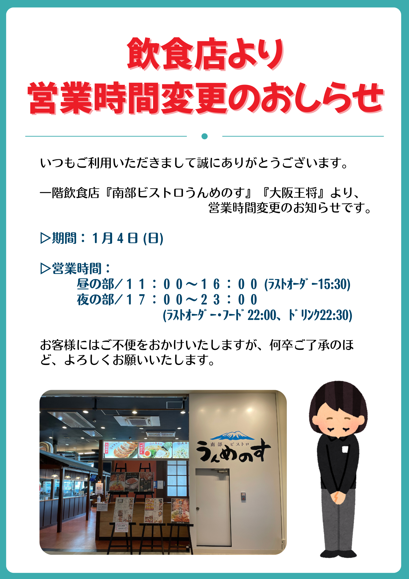 - 一階飲食店『南部ビストロうんめのす』『大阪王将』より、営業時間変更のお知らせです。
