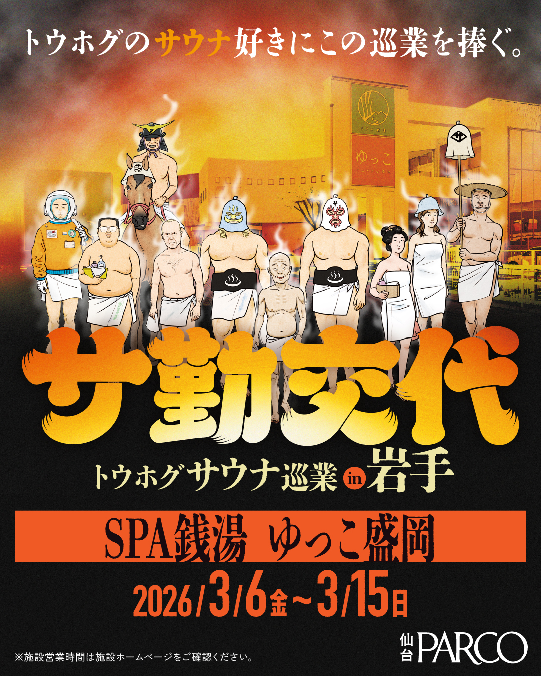 - この度、ゆっこ盛岡に仙台パルコ様主催の「サ勤交代、トウホグサウナ巡業」が開催されます。内容は東北各地の施設の紹介やサ勤交代オリジナルグッズの販売です。