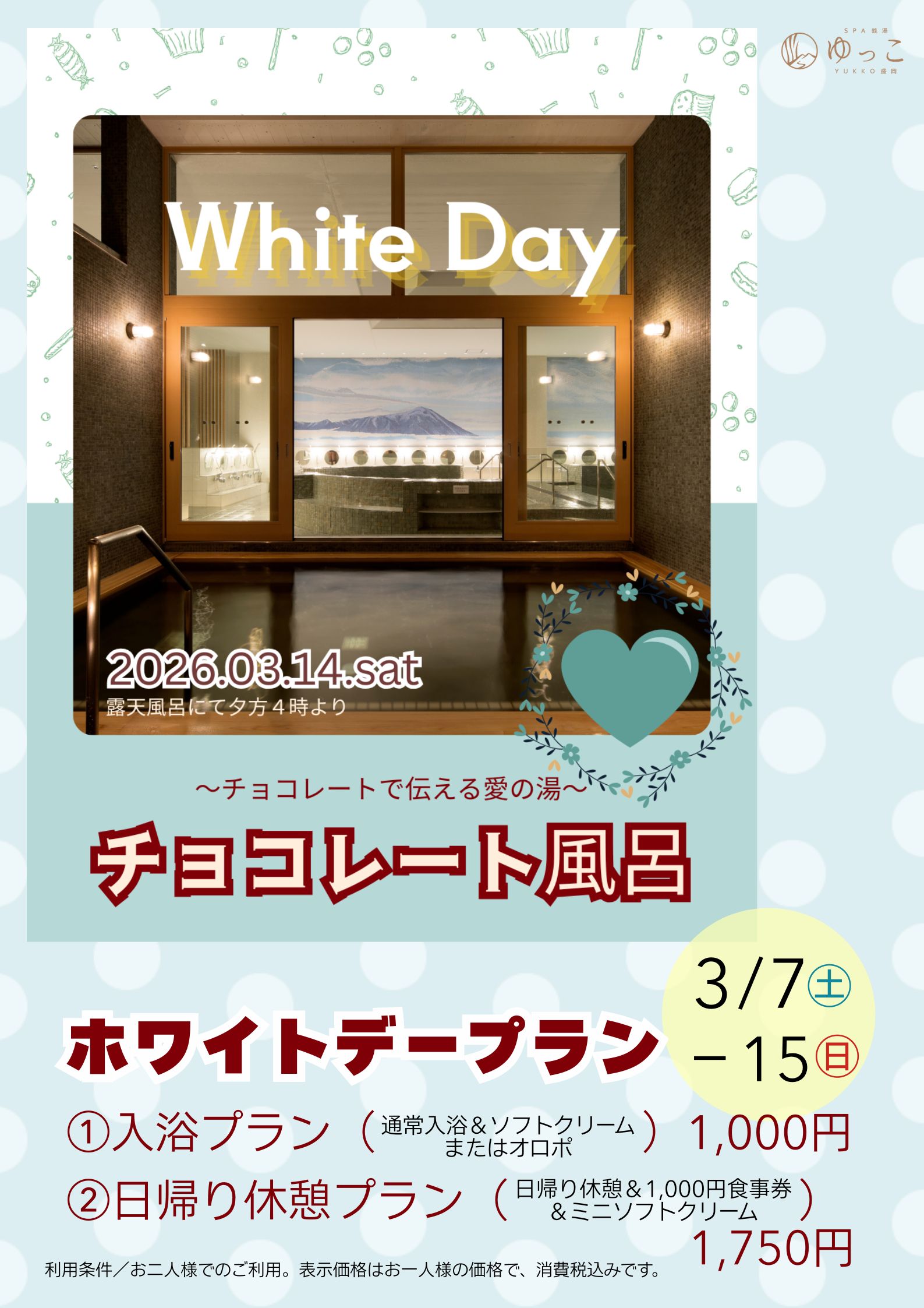 - お得なプランは3/7㊏から。ホワイトデーチョコレート風呂は3/14㊏♪